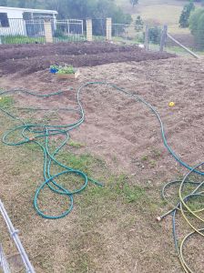 He finally got it to the stage where we could start conditioning the soil. We bought bags of Dynamic Lifter which is an organic fertiliser in pellet form. I think we used about 5 bags of that and then we put about 5 bags of organic mulch over that. Hubby then rotary hoed that all through and he was done! We put the sprinkler on to break down the organic matter over the next week and BAM ready to form up the beds!
